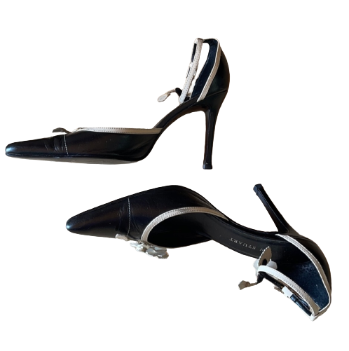 stunning pair of d'orsay heels with ankle strap in black with white flower applique.
